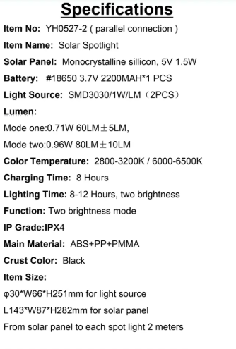 YH0527-2 Specifications Solar Panel: onocrystalline sillicon, 5V 1.5W Lumen: Mode one:0.71W 60LM±5LM,Mode two:0.96W 80LM+10LM