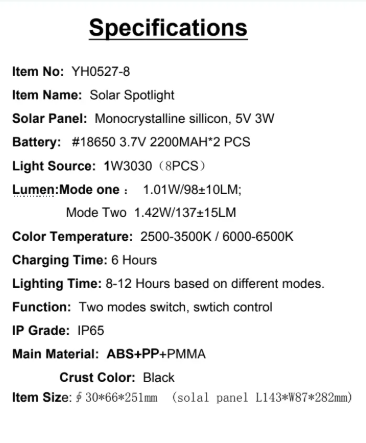 YH0527-8 Specifications Solar Panel: Monocrystalline sillicon, 5V 3V Light Source:1W3030(8PCS)