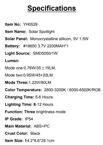 YH0529 Specifications Solar Panel: Monocrystalline sillicon, 5V 1.5V Light Source: SMD5050/1W