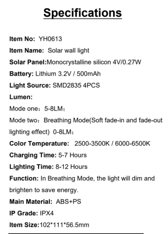 YH0613 Specifications Solar Panel:Monocrystalline silicon 4V/0.27W Light Source: SMD2835 4PCS