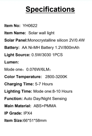 YH0622 Specifications Solar Panel:Monocrystalline silicon 2V/0.4V Light Source: 0.5W/3030 1PCS