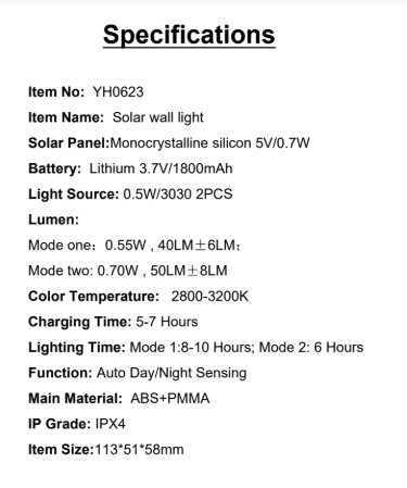 YH0623 Specifications Solar Panel:Monocrystalline silicon 5V/0.7V Light Source:0.5W/3030 2PCS