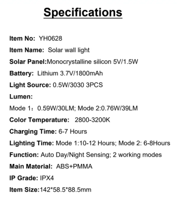 YH0631-PIR Specifications Solar Panel: Monocrystalline sillicon, 5V 2.5W Light Source:SMD2835/0.2W/LM(73PCS)