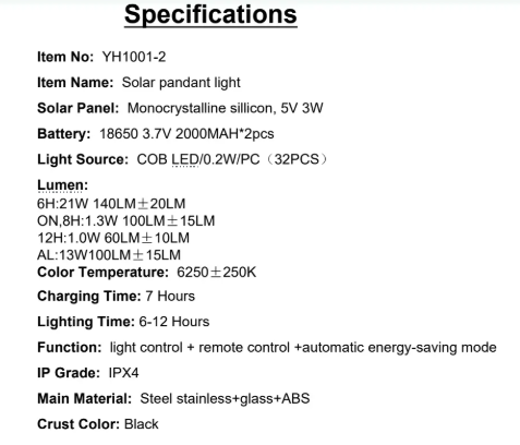 YH1001E-2-W Specifications Solar Panel: Monocrystalline sillicon, 5V 3W Light Source: COB LED/0.2W/PC(32PCS)
